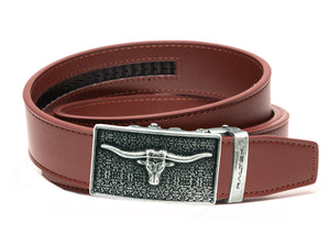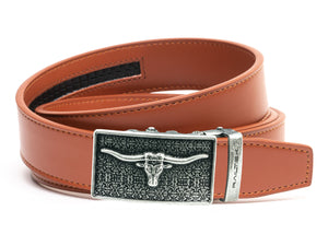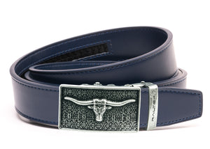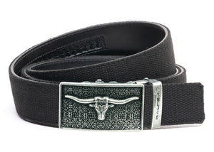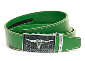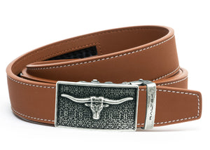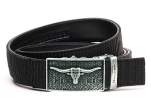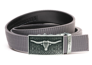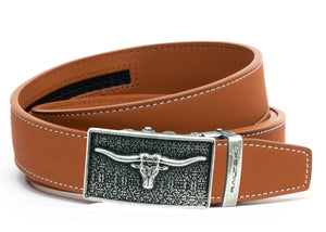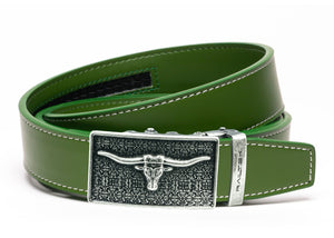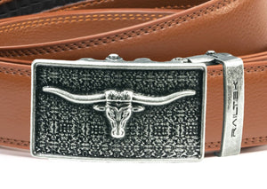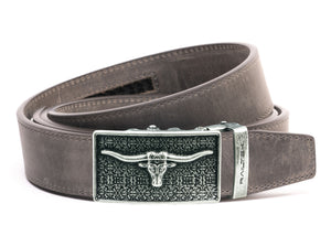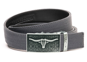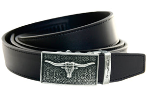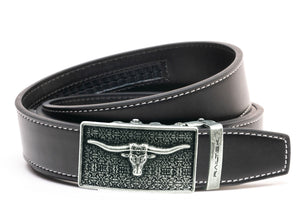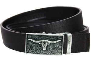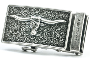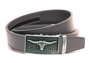 Simple, Bold, Comfortable, and Sleek. Our NEW Western Series of Belts and Buckles will leave you feeling like 'John Denver' himself. This belt will help influence your wardrobe and add the finishing touch you need for your look. The western series buckle, ratchet belt not only slides on smoothly, but adjusts to any waist size. This buckle is a timeless look and works for any look... business, outdoors, casual, or formal. You can wear this slider Silver Bull belt looks good at the golf course, on the farm, ranch, or just around the house. There's nothing dull polished or just another satin finished metal about this belt.